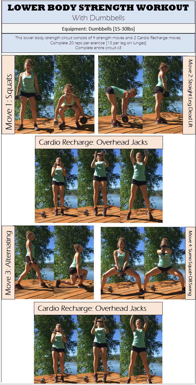 Build stronger, leaner legs with a lower body strength training circuit. These 4 strength moves, mixed with 2 cardio recharges, are sure to make you feel fit, happy, and healthy! And if nothing else, sore!