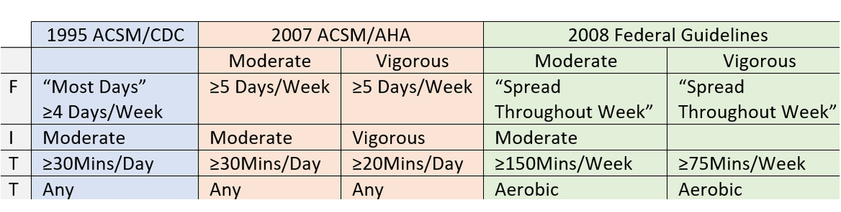 Our first set of physical activity recommendations was released in the ’90s. In 1995, the American College of Sports Medicine released a set of guidelines with the Centers for Disease Control. These guidelines stated that a healthy adult should accumulate at least 30 minutes of moderate physical activity in at least 8-10 minute bouts most days of the week.