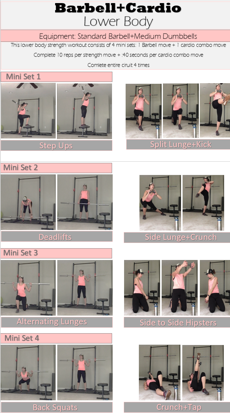 All you need for this workout is a standard barbell (weight plates optional depending on fitness level) and a set of light-medium dumbbells. This workout is built around 4 mini-sets. Each mini-set contains 1 barbell strength move and 1 cardio combination move. Perform each strength move for 10 reps and each cardio combo move for :40 seconds. Complete the entire circuit 4 times for a total 30 minutes of leg busting, muscle engaging, heart pounding workout! Remember to alternate left/right sides when appropriate! [For instance, do the Side Lunge+Crunch and Crunch+Tap with your right side the first time through and then switch to your left for the second time through!]