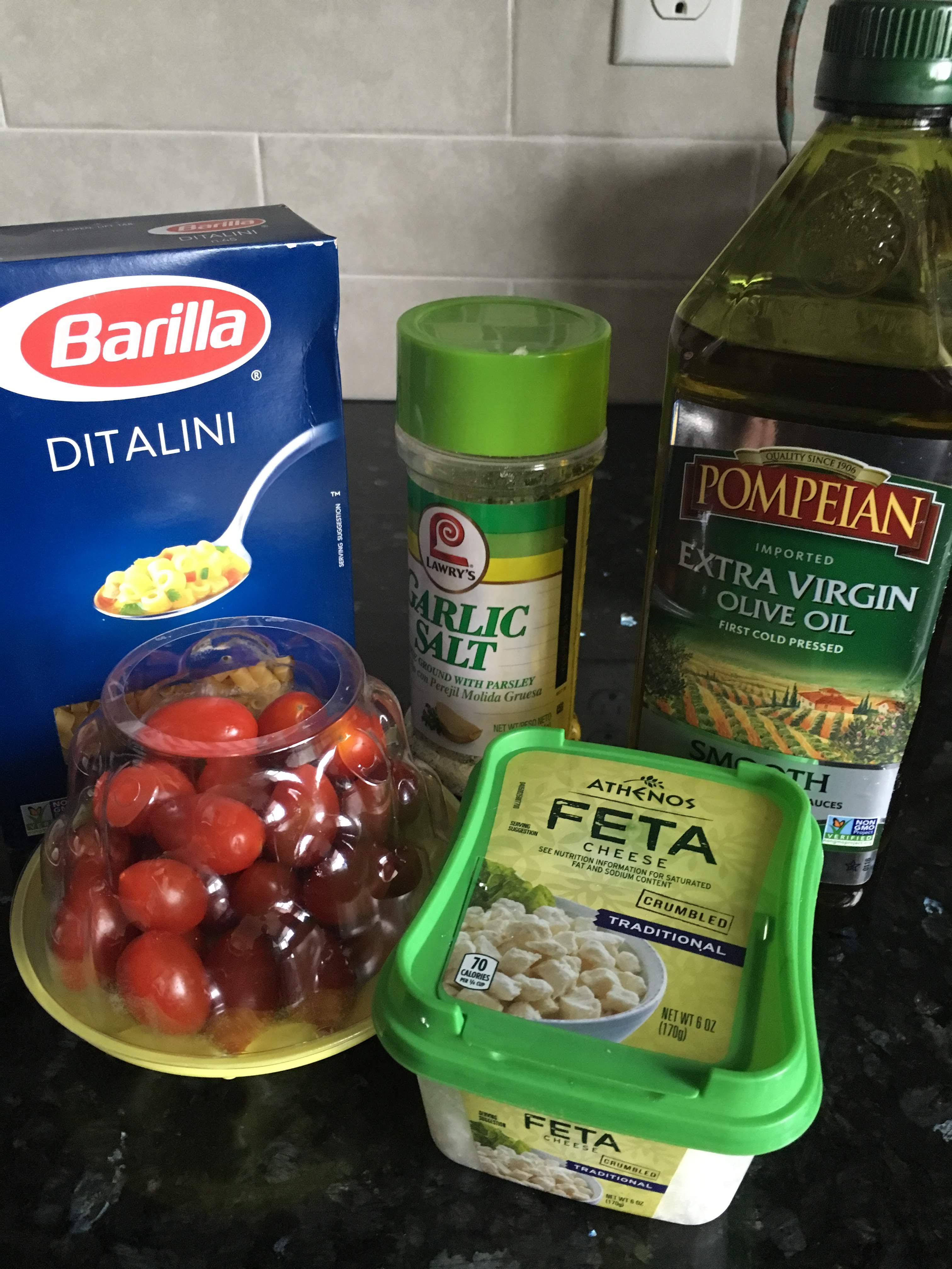 In my take on orzo salad, I have simplified the ingredients to 5 main players: pasta, olive oil, feta cheese, tomatoes, and seasoning. While yes, the actual orzo pasta exists, in this recipe, I swap it for a slightly larger pasta type, Ditalini. At first, it was just taking what the small market near my apartment carried, and when I saw they did not have orzo, I just bought the smallest thing they did have. In truth, I now much prefer the Ditalini pasta over the traditional orzo. I know, all pasta’s the same stuff just in different shapes! But the larger noodles just seem to have a lighter taste and hardier texture much more pleasant to me than the tiny, buttery grains of orzo!