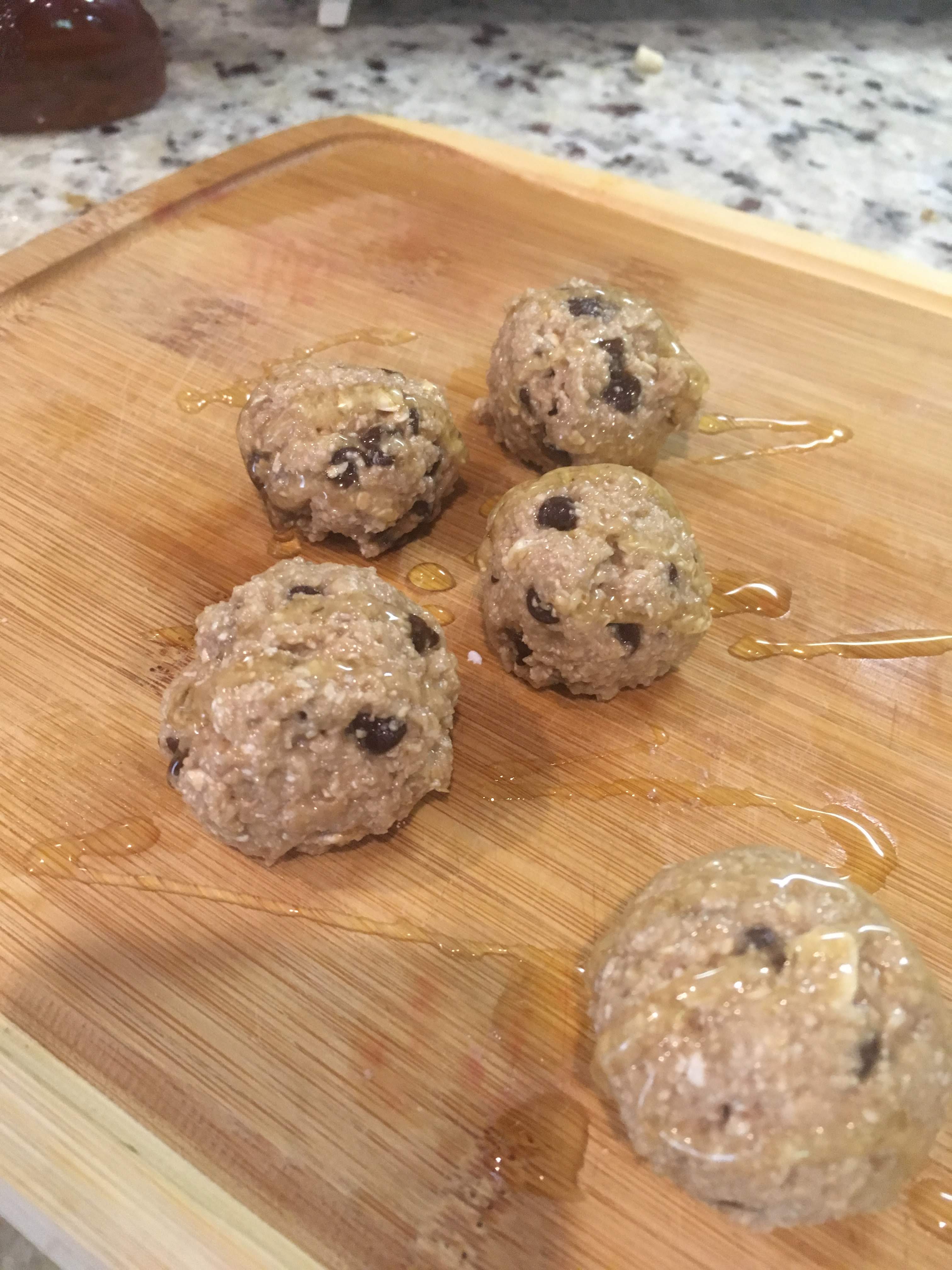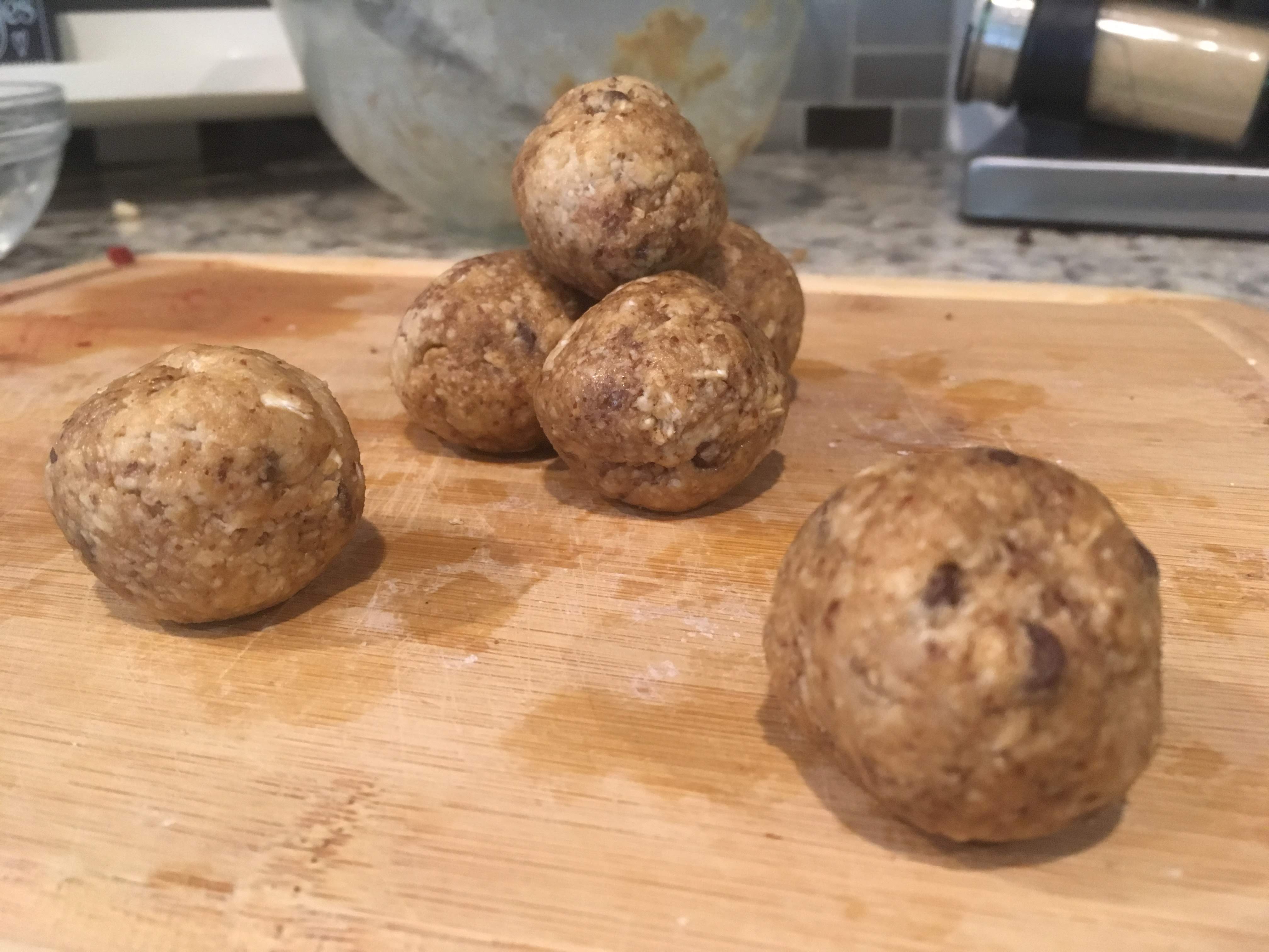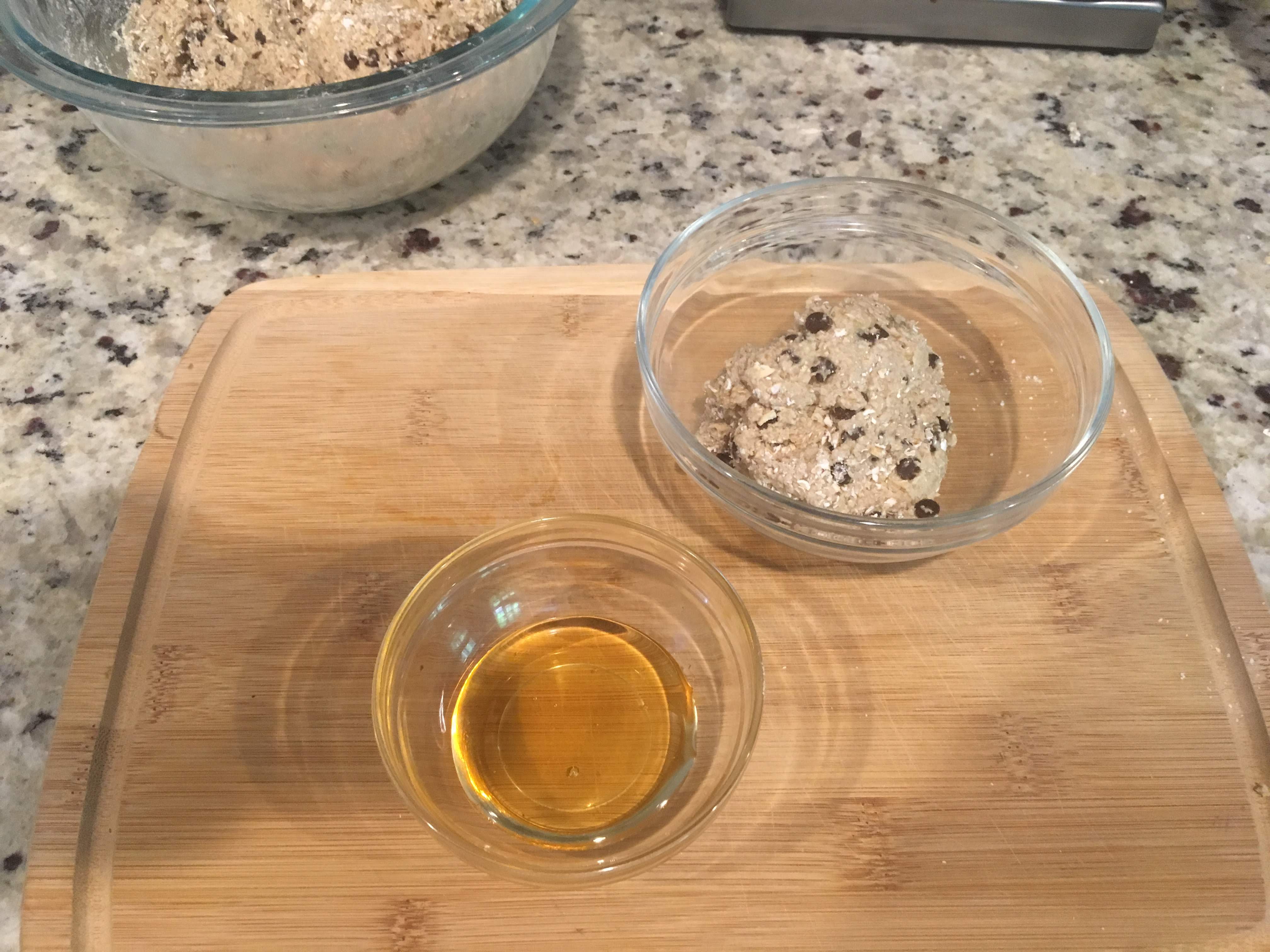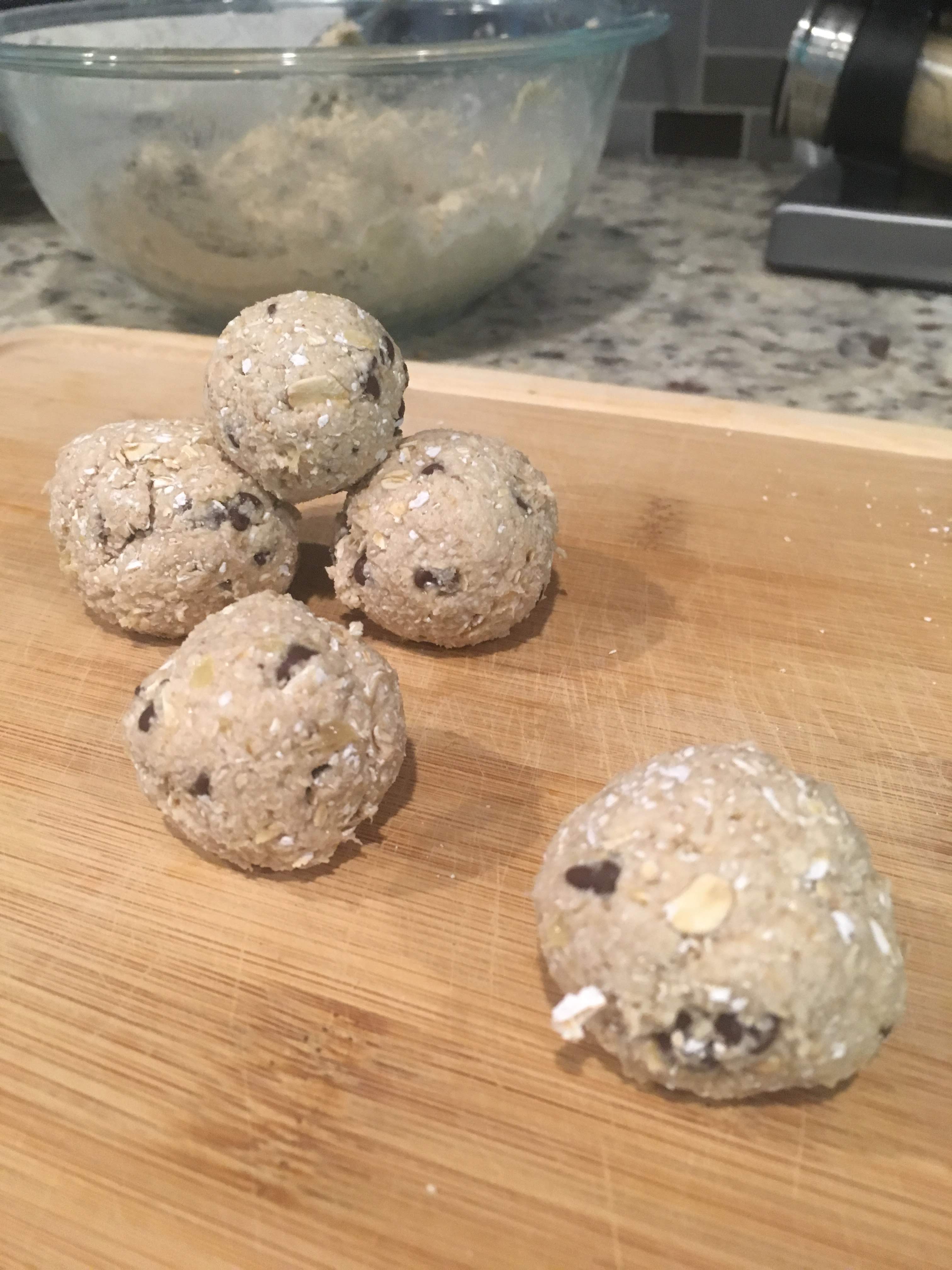 - Stir in oat flour until consistency is like cookie dough (a bit sticky, but capable of being handled and rolled)
