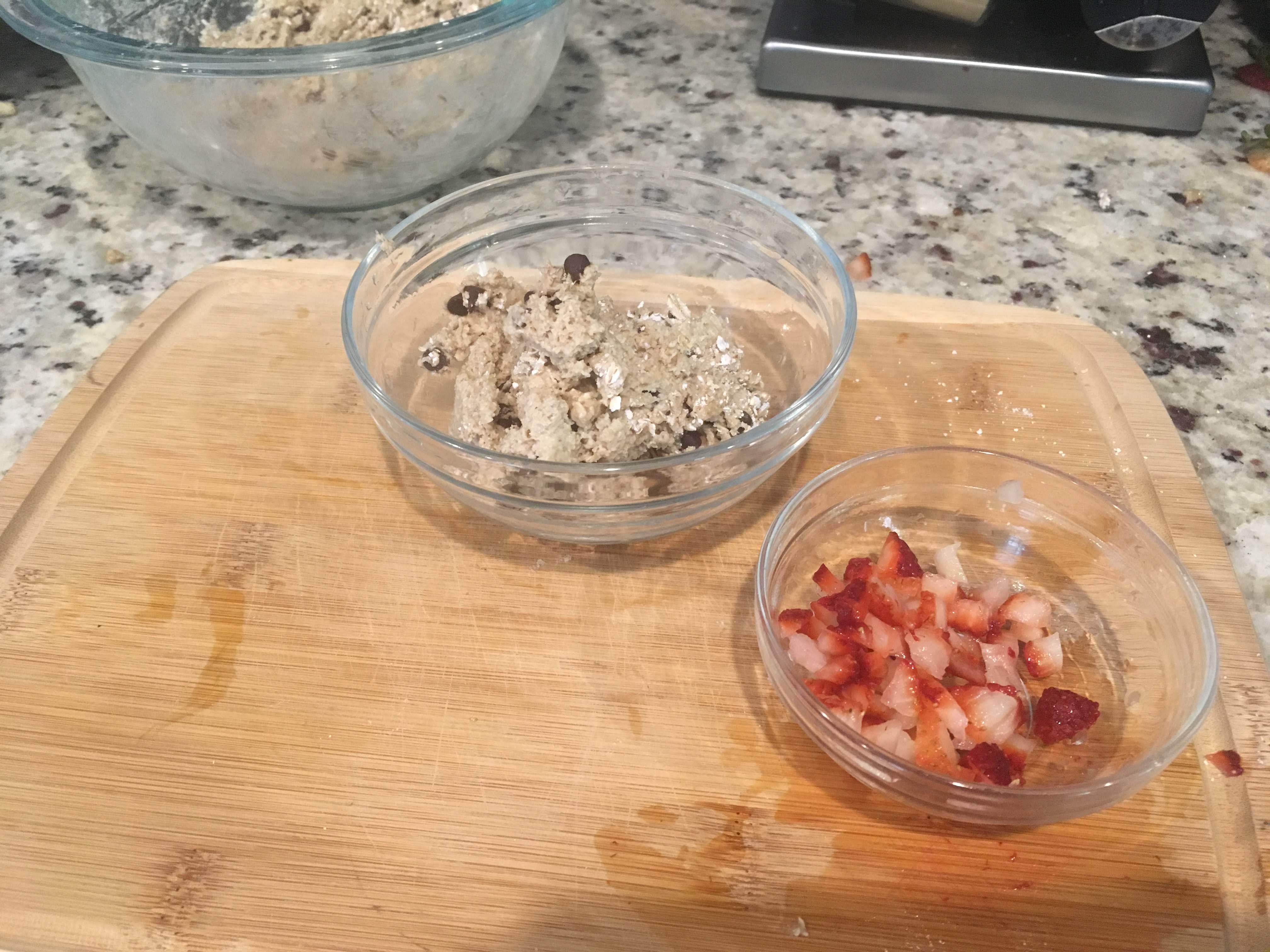 - In a medium bowl, combine bananas, oats, chocolate chips, and strawberries