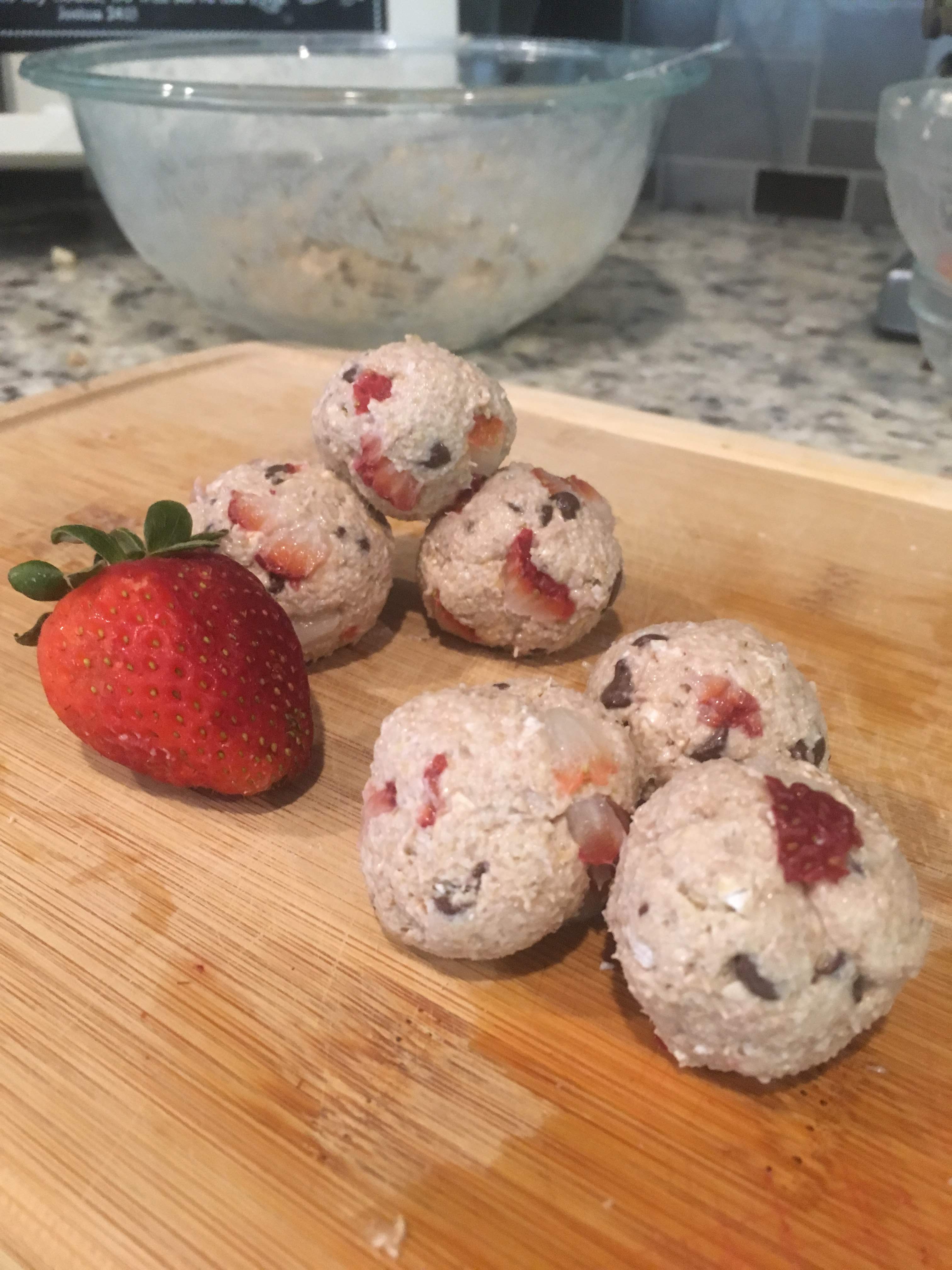 I chopped up about a 1/4 cups fresh strawberries for these milkshake bites. They mixed well into the dough and stored nicely -no bleeding, no wilting, etc.