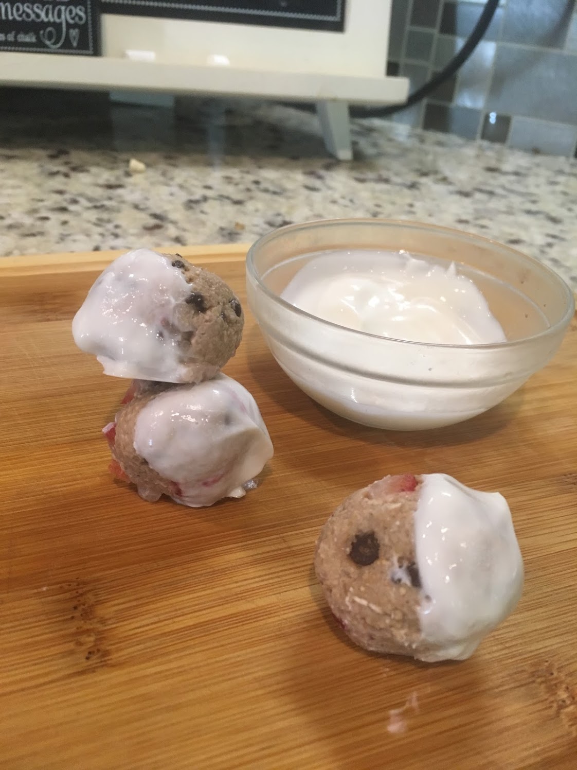 - In a small bowl, dip the bites in vanilla greek yogurt